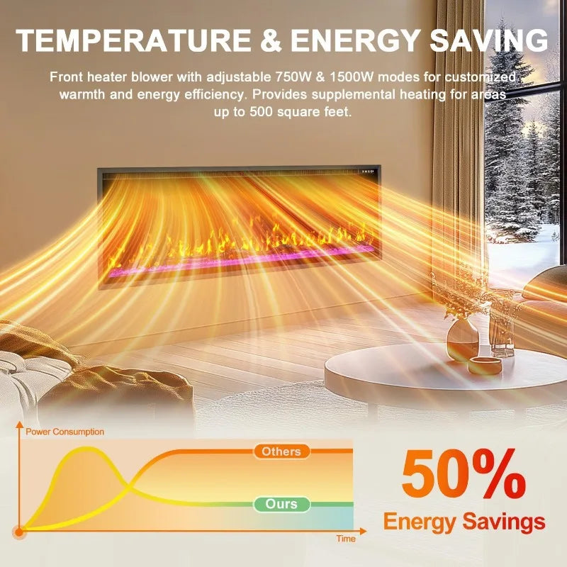 - Efficient Heating Options: This 60 inch fireplace features 750W/1500W heating and an adjustable thermostat range from 62℉ to 86℉, this wall mount fireplace allows you to personalize your preferred warmth while maintaining a consistent room temperature. The powerful 5100 BTU output efficiently heats spaces up to 500 sq ft of space.