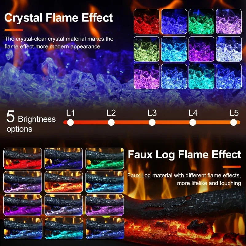 - 2 Set Faux Log & 1 Set Crystal Options: This wall fireplace equipped with faux fire logs and crystal glass to replicate the traditional fireplace look of burning coals. The interchangeable ember beds and flame color options let you set the perfect mood, creating a stunning ambiance for gatherings or quiet evenings at home.