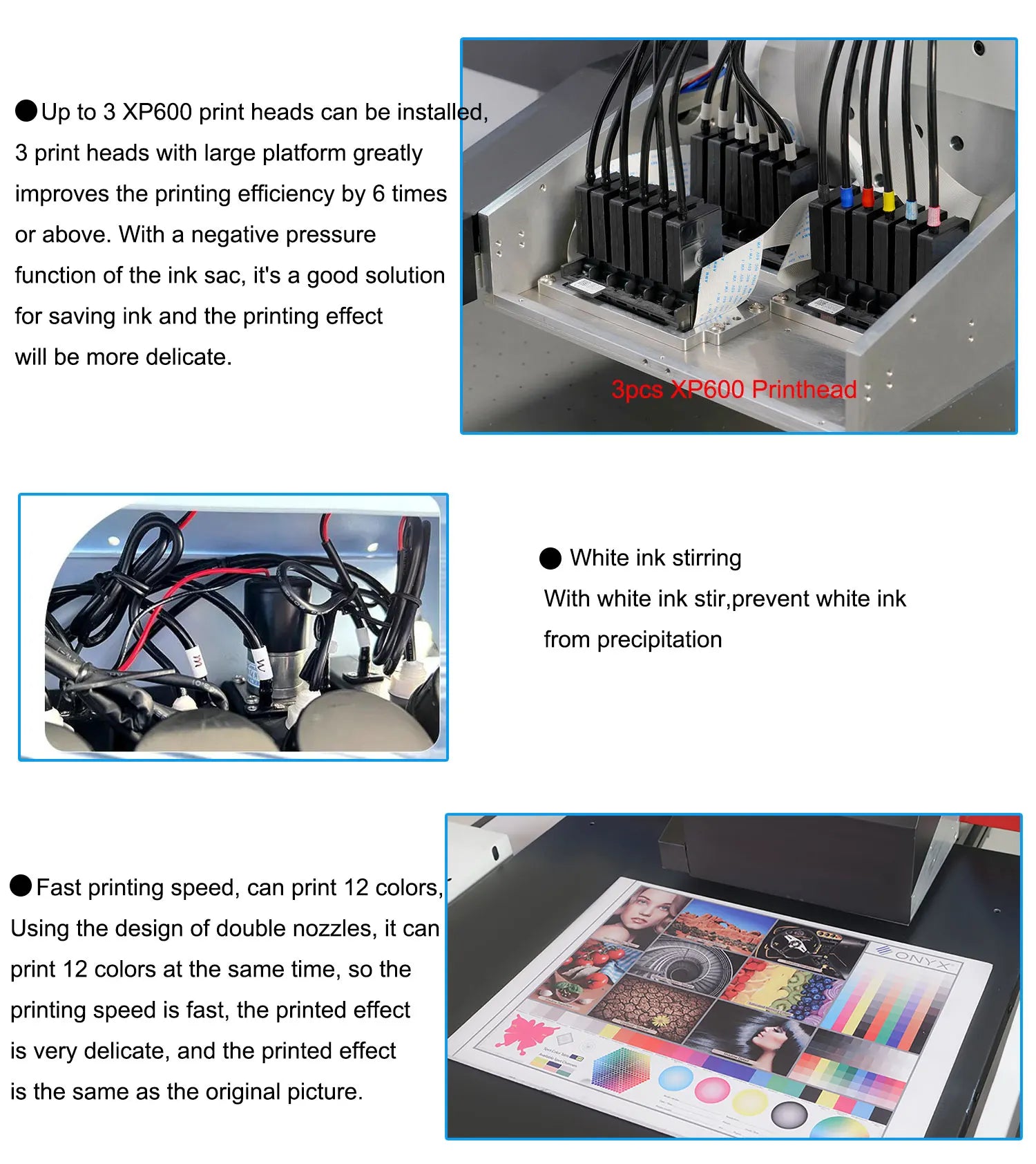 Many of these UV 6090 machines come with 3 Epson XP600 print heads (often custom‑modified or adapted for UV inks) to provide multiple color channels.