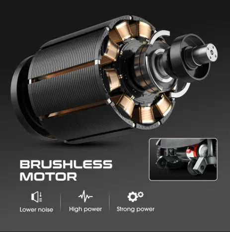 Rear suspension helps absorb bumps; brushless motor is nearly silent. -