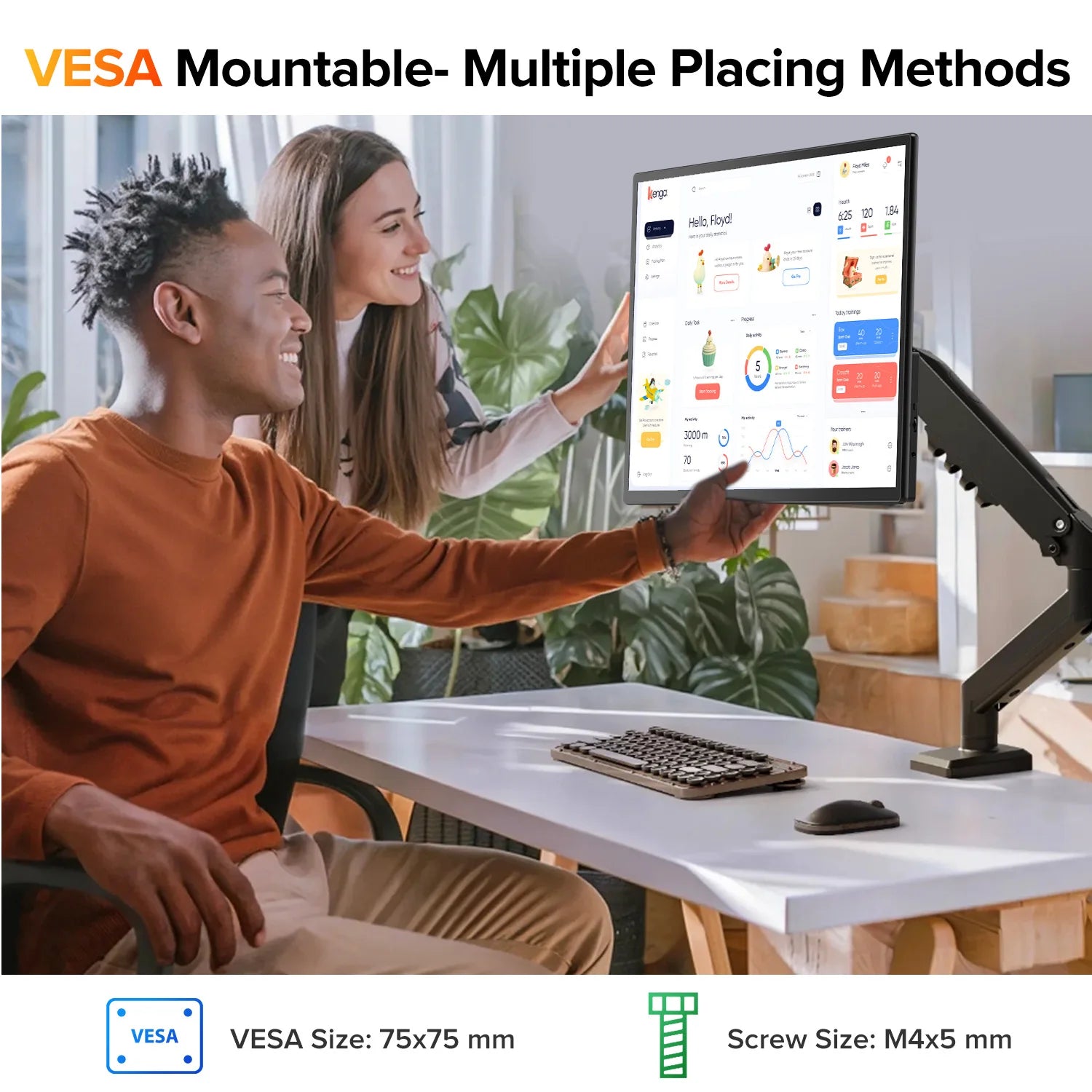 Physical / Mechanical Features | Slim / thin bezels, aluminum body or alloy casing; built‑in adjustable stand or kickstand; VESA mount holes (75×75 mm, often using M4 × 5mm screws) so you can mount on a stand / arm. |